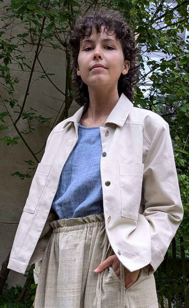 Die Jacke Xenia aus Schurwolle/Baumwolle, darunter ein Simple Top aus Baumwolle/Batist mit der Hose Texana aus Rami.