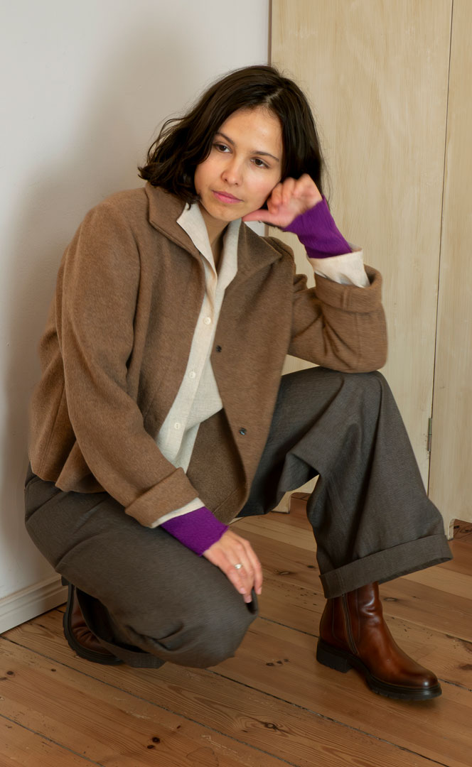 Mit dieser Jacke fing alles an: Walkjacke Anna. Wir nennen sie Pullover-Jacke, denn sie ist sowohl zum Drunter-, als auch zum Drüber-Tragen gut geeignet. Im Frühjahr bis zum Herbst mit Shirt oder Bluse darunter, im Winter als Zwischenschicht mit Mantel oder Parka.